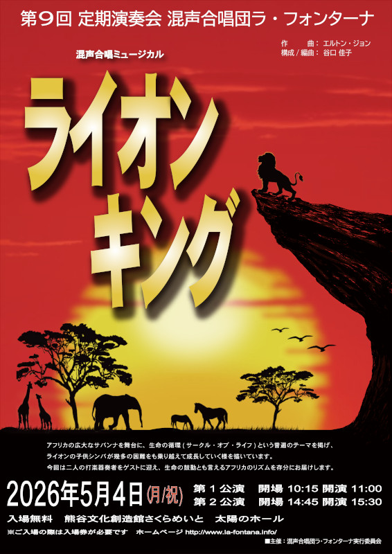 今回もご指導・指揮者でいらっしゃいます谷口佳子先生に、ライオンキングを合唱ミュージカルとして編曲していただきました。 赤間亜紀子先生の素晴らしい伴奏でアフリカのサバンナで生きている動物たちのストーリーを歌・台詞・ダンスで表現いたします。 衣装と道具も大変な見所です。
